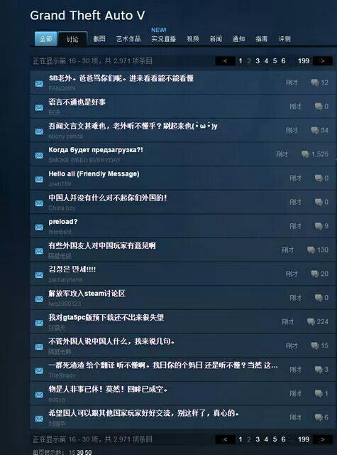2015年4月,Steam的《GTA V》讨论区里涌入了大量使用中文发帖刷屏的大陆玩家,一度引发外国玩家抗议