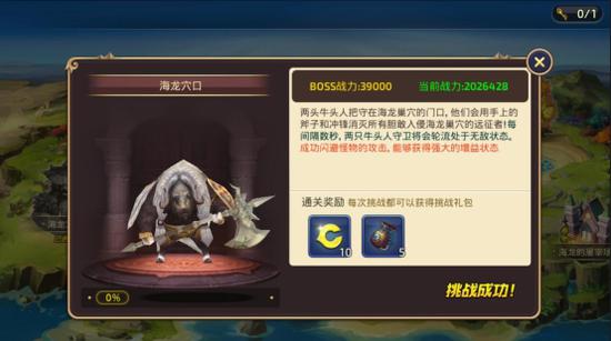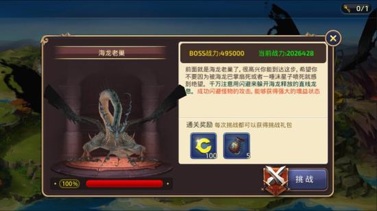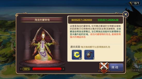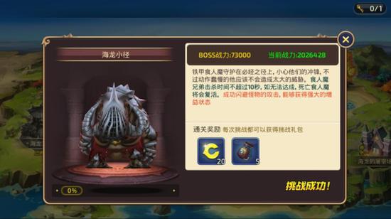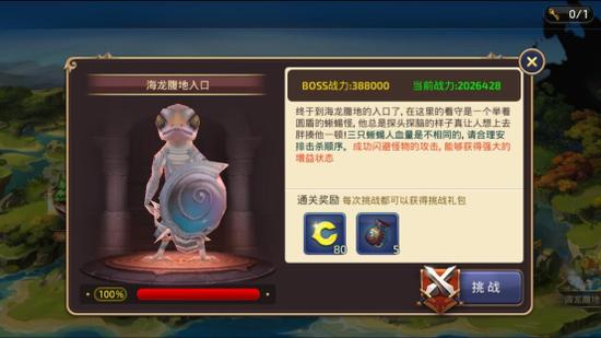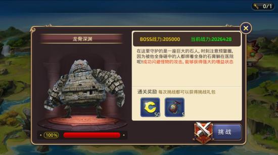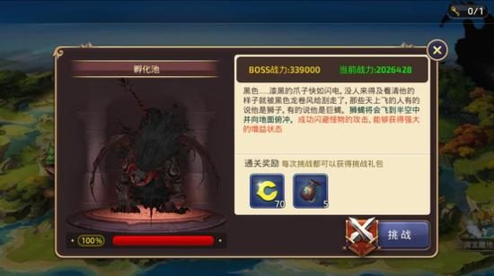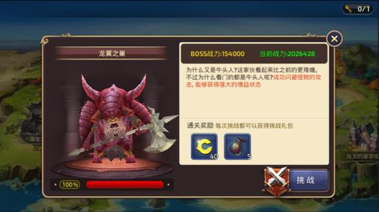 进入这个界面后,我们能看到对应关卡的更详细的信息。如BOSS的战力,形貌,简介以及当前血量情况,简介当中还会以标蓝的形式来显示BOSS的特殊设定,这点对挑战的玩家来说尤其重要。此外,还能看到通关奖励和挑战按钮,点击这个按钮我们就可以开始挑战BOSS了。