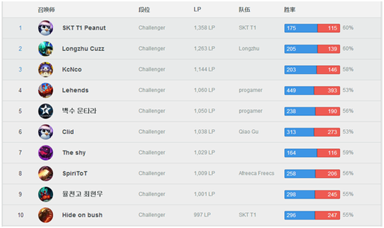 前十名分别是SKT打野Peanut、Longzhu打野Cuzz、The shy的小号-KcNco、前Sbenu辅助Lehends、CJ上单Untara、QG打野Clid、路人锐雯高手-The shy、AFS打野Spirit、路人劫高手-栗川高中崔贤宇(音译)、SKT中单Faker。