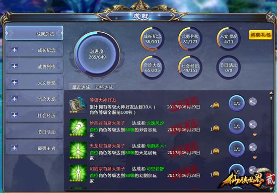 玩家可以通过快捷键“O”打开《仙侠世界2》的“成就系统”。在该系统中提供了多种多样的成就种类,从成长纪念,到人文景观,再到社会经历、节日活动、甚至武勇列传和奇珍大观,玩家都可在成就的大家族中一一找到。