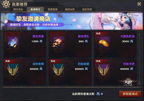 在邀请商店可以通过挚友邀请点数兑换各式精美奖励,更有终极奖励紫色品质的[烈金天使]。