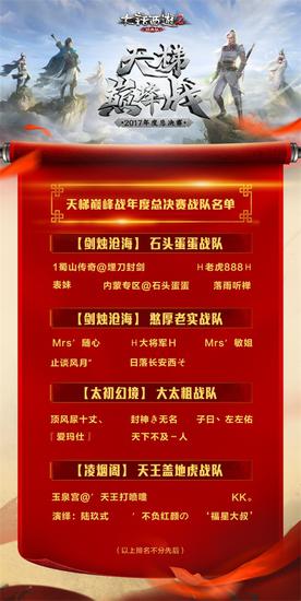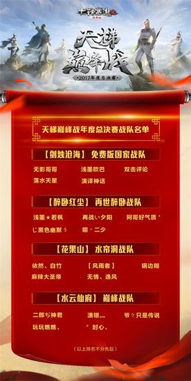 以《大话西游2免费版》天梯巅峰战2016冬季赛、2017春季赛、2017夏季赛的赛果为依据,目前已有四支顶级战队依照比赛规则受邀参加7月15日在三亚举行的年度总决赛,他们将作为江湖最强战队的实力表率,争夺年度总冠军荣耀,他们分别是(以下排名不分先后):