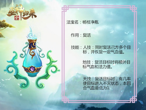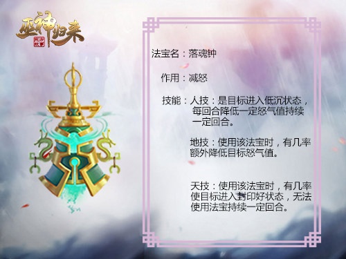 何为法宝?法,佛教意为心法、规则、智慧和修行解脱法门,道教意为长生法门。宝,佛教意为智慧的结晶,道教意为诀窍。后来,演变成了神话传说中能降妖伏魔的宝贝。《巫神归来》中就有许多东方神话中最真实的法宝,不同的法宝能对战斗起到不同的辅助作用,而不是决胜的关键,也恰恰回到了法宝二字最初的意思。