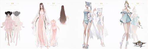 同时,画册中还展示了游戏中许多受欢迎的时装原画。左侧的芷粉和巧夕是七夕的主题时装,粉嫩的色系引发少女心爆棚,迫不及待的想要到游戏中去试穿一番。