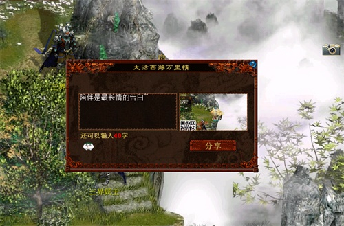 相约大话,万里寄情!活动期间,游戏界面右上方会出现“相机”图标,诸位玩家可点击图标,长按鼠标左键进行范围抓取,截图后输入想要表达的话,可分享至个人空间(端游版)或分享至微信、易信朋友圈(口袋版),每天首次完成分享即可获得奖励。