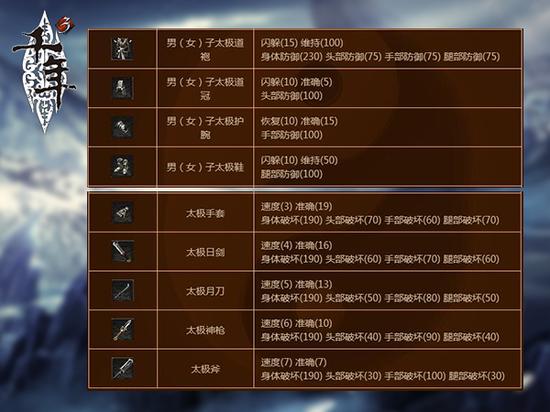 击败太极密室里的太极公子,就可获得至宝太极明珠。使用太极明珠,可以和太极老人兑换如太极道袍、太极道冠、太极护腕等强力的太极装备以及太极月刀、太极日剑、太极神枪等太极神器。若获得青龙碎片,还可到NPC处合成青龙战甲、青龙头盔、青龙护腕等装备。青龙碎片则可通过击杀赦龙组、青龙刺客、太极公子等怪获得。