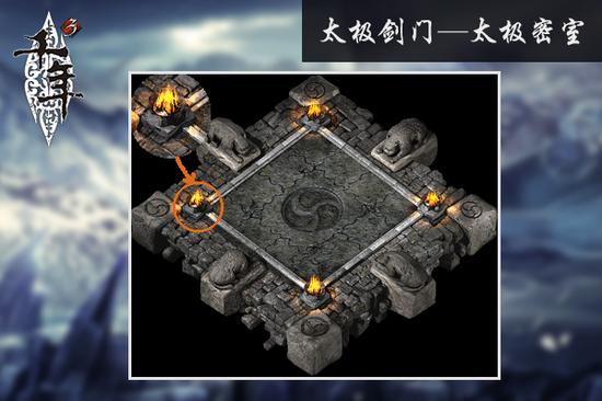 无极新区的太极剑门延续了原先的经典玩法设定,门内步步机关,步步惊心。入口的剑堂布有5个火炉,只有点燃它们,入口的石门才会开启,进入石棺洞后,英雄们将面临更大的挑战,如在众多酒坛里找到特定的酒坛打开拦路铁窗、广场杀怪点蜡台、机关区躲巨石、密室燃火炉等等……唯有拥有强大计算能力、敏捷反应速度及默契团队配合的英雄们才能闯关成功,获得最后的奖励。