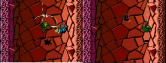 如果说魔界村靠运气会有可能通过,那么《忍者蛙》开发者在设定上似乎就不像玩家能够通过一样,各种让人只想摔手柄的飞行模式不断的乱入。随着关卡不断的通过,游戏的难度会越来越高,角色的技能也会发生改变。如果说第一关的诸神黄昏之峡谷是比较简单的横版过关游戏,和双截龙一样用拳脚就可以解决所有的怪物,那么到了第二关无底洞,就开始进入了困难模式,忍者蛙攀附在一根细绳的一段,不断地在这个洞穴里面下降,而在洞穴的两边会不断出现停留的乌鸦,惊醒的乌鸦只要轻轻的一碰,你的绳子就会断掉。期间还会有飞行的机器发射出电流,也可以破坏掉绳子。让你时时刻刻都保持着警惕,神经就像那一个根绳子一样,嘣~,都不知道什么时候就会断掉。