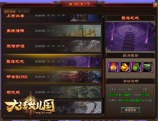 乱世之中,强者为王!在三界之中,有一个名为“堕落之地”的地方,这里聚集了来自三界各处的英雄们!在37《大话女儿国》的“堕落之地”战场被分为三个阵营仙、魔、妖,每个阵营10个玩家。进入战场的玩家随机分配至3个阵营之一,在这片混沌之地肆意斗争!究竟是谁会战到最后呢,且让我们拭目以待!
