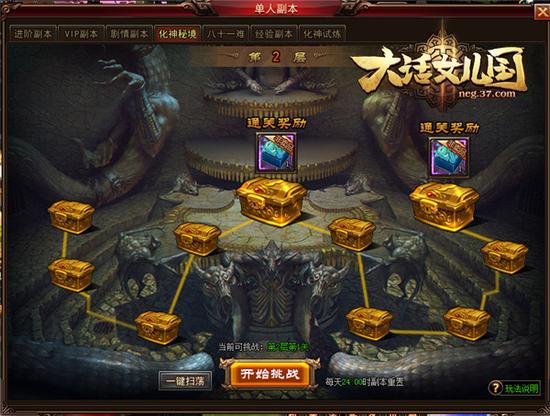 练精化气,练气化神,练神还虚,练虚合道,“化神秘境”乃天地神秘之地,仅允许你只身一人前往探索挑战!在战斗中,37《大话女儿国》的玩家可变化成神将获得惊天动地的神力,但是想要提升化神等级,获得更加强大的力量,化神秘境是一个必选之路。