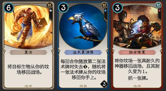 游戏中五种颜色都有利用坟场的特色卡牌。代表变化与智慧的蓝色可以从坟场中找回法术牌,红色的波葛族工匠大师可以从坟场中找回废弃的神器,代表光明与正义的白色则可以从坟场中复活单位。