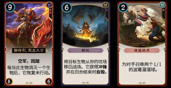 掀坟流:这里列举一套常用的掀坟流核心卡牌-[腓特烈·驾龙大公]、[迷惑战术]、[掀坟],试想对方千万百计解掉了这张9费大哥牌,却又被[掀坟]重新召唤回场上,还被挂上两个溜溜球,那是怎样一种绝望的心情。