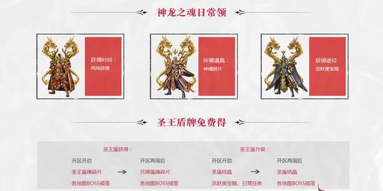 本次新区开启一大超强福利在于神龙之魂和圣王盾牌将开放免费获取途径。在开区后,玩家可以在活跃度宝箱、日常任务、BOSS掉落等途径获得神龙之魂碎片、圣王盾牌碎片、元神盾牌碎片、圣盾结晶等道具。不论是神龙之魂还是盾牌,都可以免费获得、升级。同时,在落霞夺宝、五行宝地、灵犀仙岛中还将产出组合技能残章、骑战技能书、元力精华、境界丹、装备宝石等道具,产出提升,助玩家战力飞升。