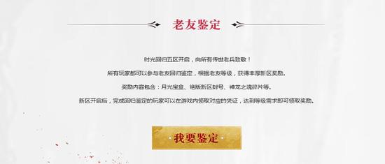 入驻时光回归五区的玩家可以在新区专题参与鉴定,领取新区特权。根据老友等级,玩家可以获得包括月光宝盒、神龙之魂碎片、新区绝版封号在内的丰厚奖励。除以上特权外,入驻新区还可以参与包括天下第一、沙城荣耀、活跃达人在内的一系列新区活动,快速冲级,赢取新区荣耀和丰厚奖赏。