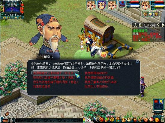 中秋佳节,同样也吸引了无数文人雅客前来咏月助兴。在活动期间每天的8:00~22:00,等级≥50级的玩家可以5人组队,前去大唐国境、大唐境外、江南野外、花果山、长寿郊外、东海湾等地,挑战六位才华横溢的游子,与他们比拼才华。在此过程中,玩家不仅能够获得丰厚奖励,还能在当天挑战成功全部NPC后,前往礼部尚书处领取中秋礼盒,收获一份节日惊喜。