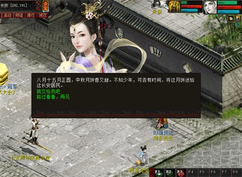 明月几时有,把酒问青天。10月4日,中秋之夜,嫦娥、玉兔、吴刚一起下凡来到长安城。诸位玩家可前往长安城东(87,122)找到吴刚购买荷灯,随后在长安城东(95,121)附近放置,陪私自下凡的玉兔玩小游戏,在规定时间内旋转爆竹的引线,使其首尾相连,在长安城或者洛阳城内找普通NPC进行对话,将来自嫦娥的月饼送给他们。