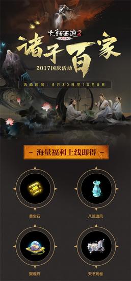 导语:海量福利上线即得,珍稀道具随机投放!《大话西游2免费版》2017国庆活动今日火热开启,9月30日至10月8日,连续九天福利天降,八大活动齐贺华诞,与百家门徒斗智斗勇,问道先贤求学诸子文心,怀古游今迎百家朝贺,于幻境学宫之中领略百家风采,更有团圆佳节与你相约共度,赢取海量经验与八荒遗风、聚魄丹、黄宝石、天书残卷等丰厚物品奖励!