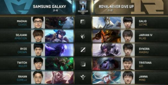 这局比赛双方都选了一套比较后期的阵容,SSG选择了打野猪妹、AD老鼠,RNG则选出了凤女保护小炮的阵容。不过双方的中单都选择了带节奏的英雄,SSG选择了可以支援的瑞兹,RNG则拿出了辛德拉。
