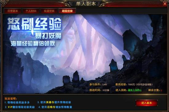 角色到达65级后,很容易卡主线剧情,这个时段的求仙任务可以做,但是不用执着。这个等级段,游戏开放了个人超级经验副本,想要快速升级的玩家,这个副本每天两次可不能落下,而且,最好把每次副本里使用英雄令和守城令的权限都用完,这样能增加不少经验。