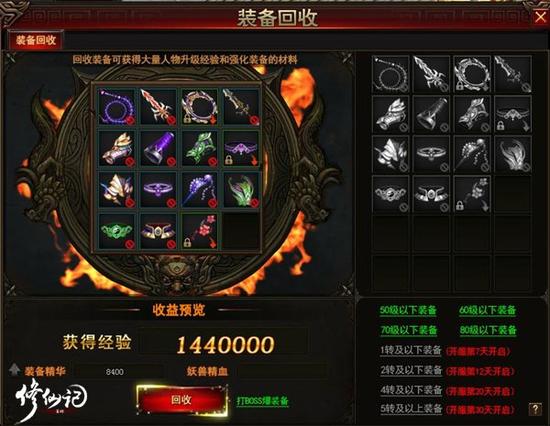 第二种方式:前往镇魔牢打BOSS,镇魔牢的进入等级限制为50级,里面有9个BOSS,每个BOSS都会掉落装备,除了自身所需的装备,其余可以用来回收,回收装备能够获得大量的升级经验,在前期也是个非常不错的升级方式。