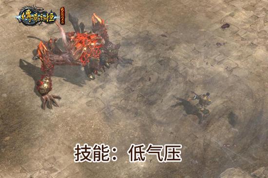 技能——低气压:范围魔法攻击,BOSS对身前一定范围吸取气流,发起攻击,有几率吸近目标,造成伤害。