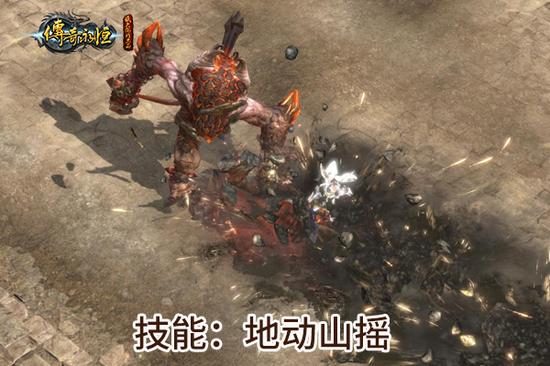 技能——地动山摇:范围魔法攻击,BOSS震击地面,对身前一定范围内的目标造成伤害,并对单个目标进行追踪落石打击。