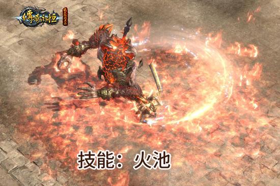 技能——火池:范围魔法攻击,BOSS在地面生成一个大范围的火焰池,每0.5秒造成一次伤害,持续5秒。