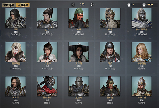 除了张飞、腓特烈一世以及其他主线任务赠送的武将外,其余武将全部开放点券购买。