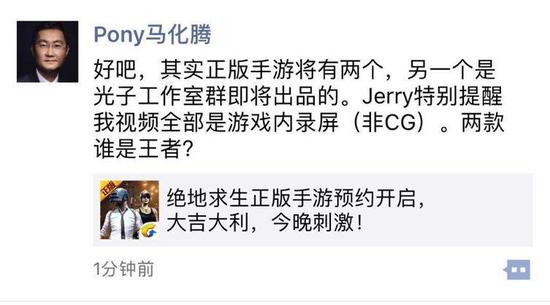 继昨天腾讯游戏嘉年华上,《绝地求生》正版手游相关信息公布后,腾讯光子工作室群凭借《绝地求生:刺激战场》游戏实录视频,火速上了微博热搜,昨晚更是流传出了马化腾在朋友圈为其点赞的截图。