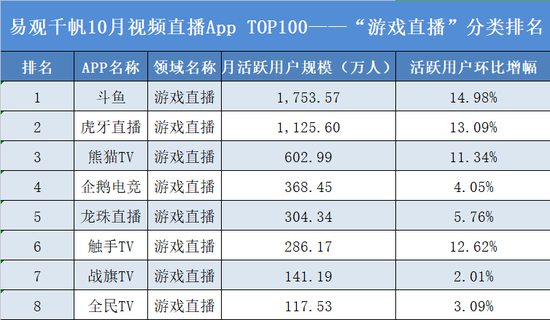 从最新的易观千帆数据显示,10月份排名前8名的游戏直播平台竟无一例出现活跃用户负增长,最低2.01%最高14.98%的月活跃用户增长昭示了在移动端领域,游戏直播行业依然是开垦网民最快最效率的平台之一。而斗鱼在此表格中变现出的碾压实力也在给同行更多的压力,超第二名55%、超第三名近两倍的移动平台月活跃人数,代表了斗鱼在游戏直播领域的深度经营和观众对于斗鱼直播的认可程度。