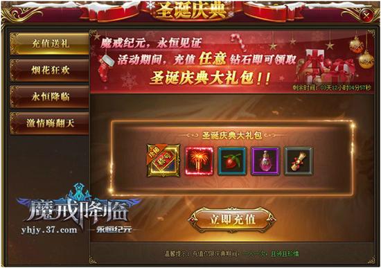 此次37《永恒纪元》页游版的圣诞庆典共有4个活动,仅在12月25日当天开启,感兴趣的朋友可要留意时间别错过了哦!第一个活动福利是充值送礼,在活动期间,只要玩家充值任意金额,即可获得圣诞庆典大礼包,内容还相当丰富哦!