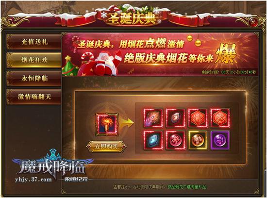 西方,圣诞节便相当于我们的春节,在这样一个重要的节日里,怎能不来点烟花助兴?37《永恒纪元》页游版的第二个活动为烟花狂欢,玩家可花费100钻石购买绝版庆典烟花,成功购买烟花后,只要双击使用,便有几率开出珍稀道具,助你提高人物属性!