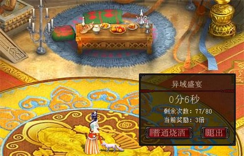一岁节序,此为之首。西域各国国王感恩众人为大唐与诸国友好所作贡献,特邀请诸位玩家前往皇宫饮宴,通过皇家盛宴接待使者光禄寺官员,可前往宝象国皇宫或女儿国王宫参加宴席。宴席中,每饮酒3分钟,可获得1次经验奖励,每天可获得80次。若饮用西域特色葡萄酒,每次可获得3倍经验奖励,但每次需消耗1通宝。