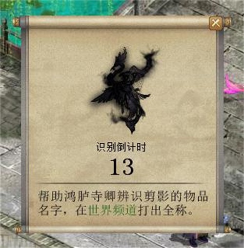 大唐强国,与友邻交,以礼为先。鸿胪寺官员紧锣密鼓送礼清单时,不慎打翻墨汁,故在每天12:01到21:01期间,每隔1小时,他会在系统频道向各位少侠求助,同时用活动图标让大家看到求助图片。诸位玩家需根据剪影图猜出对应的物品名称,并60秒内在世界频道上打出答案,第一名回答正确者可获得额外的“独占鳌头”奖励,同时随机抽出三名赠送“天赐良机”奖励!