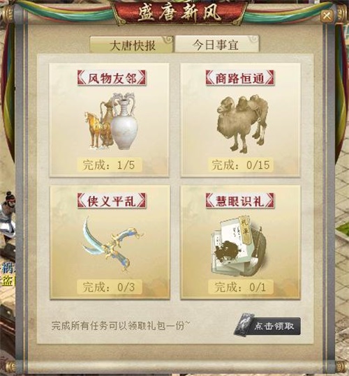 其二,每天0点可在“大唐快报”中领取各位NPC当天放送的福利;