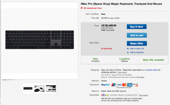因此有人开始打这套外设的主意,eBay上已经有人出价。一套深空灰妙控鼠标、妙控板和妙控键盘标价2499 美元,相当于人民币16000元。