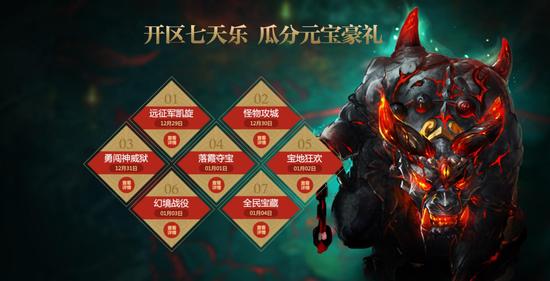 本次新区开启为玩家们准备了非常丰厚的新区豪礼。开区七天狂欢,参与每日狂欢活动,每天活动各不相同,但都有机会获得真元宝奖励。新区绑定元宝消耗返还真元宝:新区开启至1月5日期间,在新区消耗绑定元宝可以活动积分,每日积分排行前五百名的玩家都可以活动丰厚奖励,除了可以提升羽翼的幻翎之羽为,更有真元宝奖励。活动结束后,总积分排行前十名的勇士还能获得装备奖励。