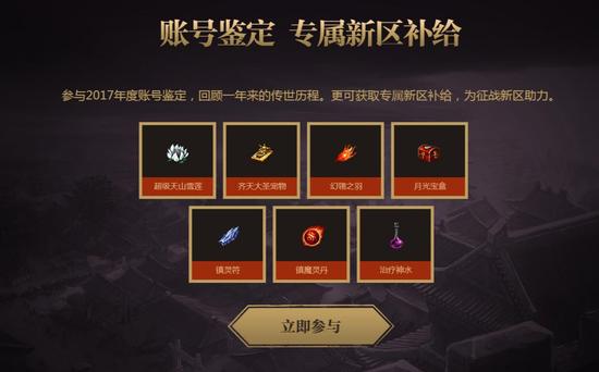 2017年账号鉴定火热进行中,参与账号鉴定,获取新区补给,可以获得包括月光宝盒、神水、专属封号在内的丰厚新区补给。除了年度账号鉴定外,超过15天没有登录过《传奇世界》的玩家,可以在活动页面鉴定为“幻境回归账号”,获得新区封号、月光宝盒、宠物令牌,助战新区。没有达到回归条件的账号可以在游戏内与老友账号绑定,获取同样的礼包。
