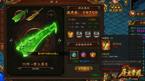 玛法大陆每一把神兵背后,都深藏着功名无数。屠龙,更代表着传奇的不朽精神印记。在37《屠龙荣耀》游戏中, “碧玉屠龙”不但是至尊荣誉的象征,更是终极力量的彰显。神兵玩法赋予了玛法大陆更丰富的趣味,同时也给玩家带来了更多维度的成长体验。当玩家激活神兵·碧玉屠龙,即可获得强大的实力增幅,除了为玩家增加大量PK伤害,更能解封酷炫十足的PK技能属性,真正诠释了玛法至尊·屠龙的辉煌传说。