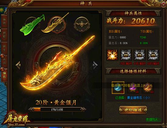 曾记得第一次玩的法师,学习火球术冲向骷髅洞的激动。通宵练级,就为拿起偃月的心潮澎湃。而今,在37《屠龙荣耀》中我们仍然可以看到这把熟悉的兵器。与之不同的是,他成为了游戏中的神兵之一。“黄金偃月”,在玩家达到一定等级,便可激活神兵—黄金偃月,届时,玩家将获得大量暴击属性,挑战更为强大的BOSS不再是难事。而黄金偃月每升一阶,都将开启更多天赋属性,让持有者成为真正BOSS噩梦。