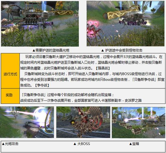 「贝鲁斯争夺战」过程中每个阶段的成功,将随机出现宝箱;战役成功后,至下一次争夺战展开前,全部国家皆可进入卡莲娜新副本-【史派罗之路】