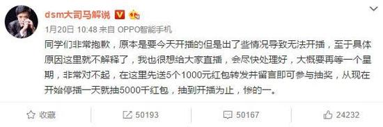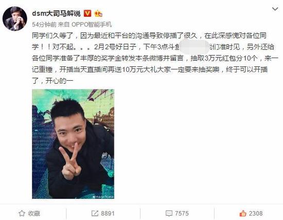 1月31日,大司马终于在微博中宣布将在2月2日重新开播,距离大司马停播已经过去了26天,开播当天就已经足足停播28天!至于直播平台,仍然是斗鱼直播,对于停播的原因,大司马表示是因为和平台沟通,这才导致停播了这么久。