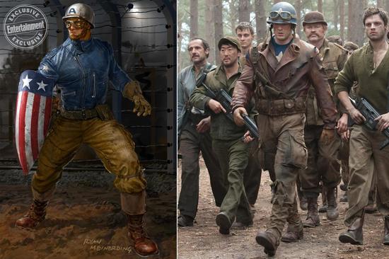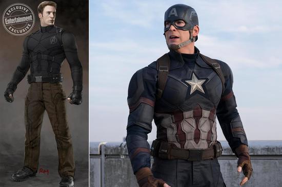 《美国队长1》早期的美队制服曾经出现过一款蓝色夹克搭配土黄色工装裤的设计,“工农兵”画风浓重。Meinerding解释说:“蓝夹克这版设计最终被弃的原因是,这让美队看起来不太像一个战士,感觉有点显摆。”
