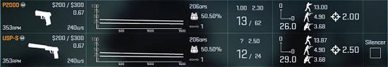关于这点,我们从武器的参数和特点角度来看一看。在主要参数上,如伤害、距离衰减、穿甲系数、射速等等,USP与P2000是是一模一样的。