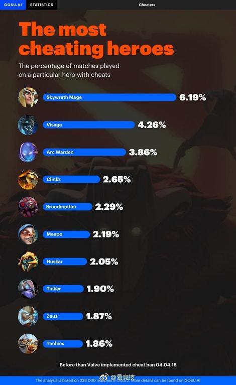 之前国外研究团队GOSU AI报告指出,DOTA2游戏中有12%存在开挂现象。后来他们还发布了一个各分数段开挂比例,令人意外的是低端局中开挂现象较少,反而是顶分段位开挂现象最为严重。而今天他们又发布了作弊玩家最爱使用的英雄,这次的结果仍然很意外,第一名可能谁也没有想到吧。