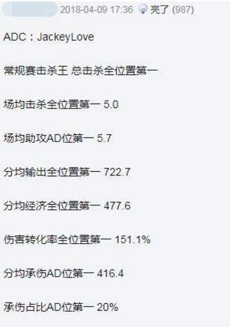 这位则做出了理性的分析:IG的比赛往往因为中路和上路个人能力太过出众而提前锁定了胜局,所以JKL能有这样漂亮的数据市全靠队友吸引火力。
