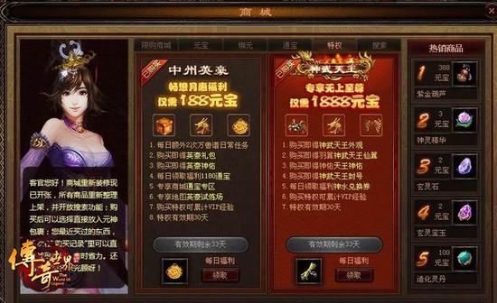 2.6版本开放后,玩家可以在商城界面购买两种特权。其中“中州英豪”属于福利向特权,售价188元,有效期为30天,可帮助玩家节省约价值350元的元宝,以性价比而著称。