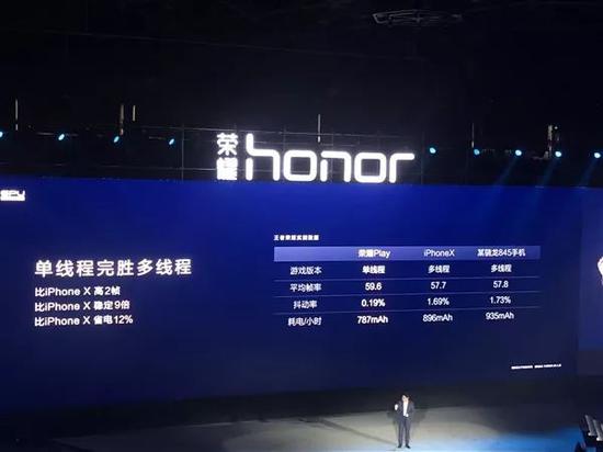 此外,和骁龙845手机和iPhone X对比,在环境温度30℃的同等条件下,从满电开始持续进行同样的游戏的情况下,荣耀Play在持续时间上最长,比iPhone X多玩半小时。