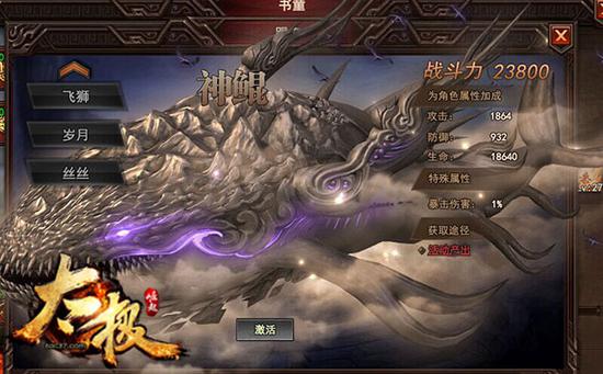 是齿鲲?尸鲲?巨鲲?还是骨鲲?这都不重要,反正开局一条鲲,进阶全靠吞!不错,在37《太极崛起》游戏中,我们的鲲天南地北、从古至今,吞遍天下无敌手!神鲲系统暂定于40级开启,开启后可为角色带来额外的属性加成。神鲲可升级进化,进化材料在神鲲·战场中可获得。