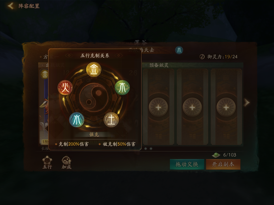 而且在战斗上游戏也讲究五行相生相克的原理,所以这就表示并不是有一个SSR的妖灵就一定能立于不败。在游戏中所有的妖怪都有其对应的五行属性,如果对战BOSS的时候选了能克制对方的妖灵,就会有加倍攻击的效果,如果被对方克制的话则会削弱伤害。